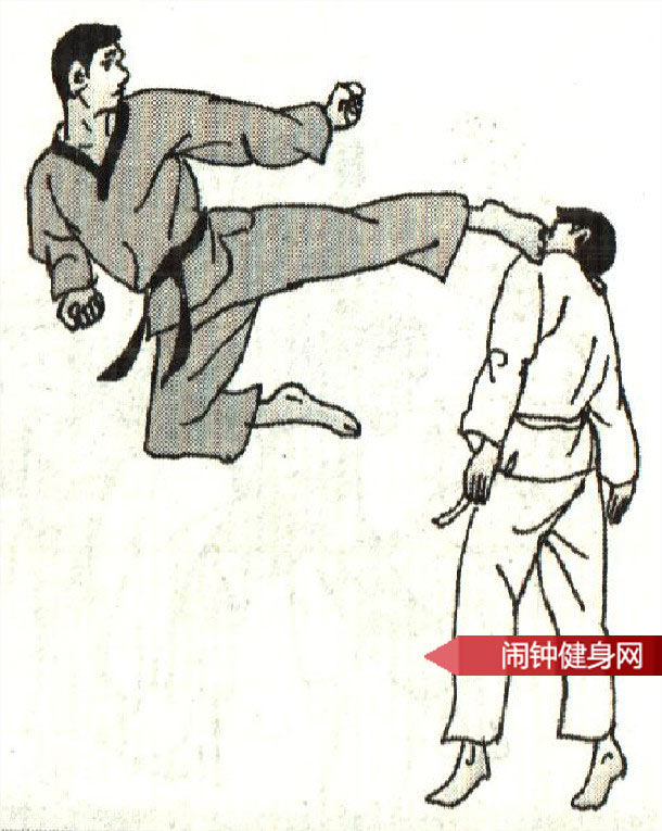 2. 我用右脚转踢其下腹部,被其左臂外挡。